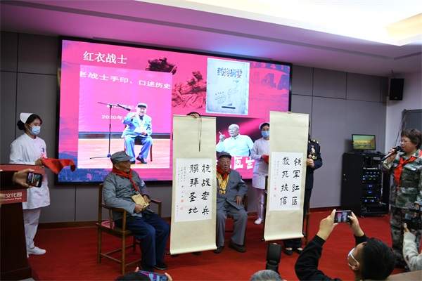 接着两位可爱的少先队员,向两位革命老前辈爷爷赠送鲜花。