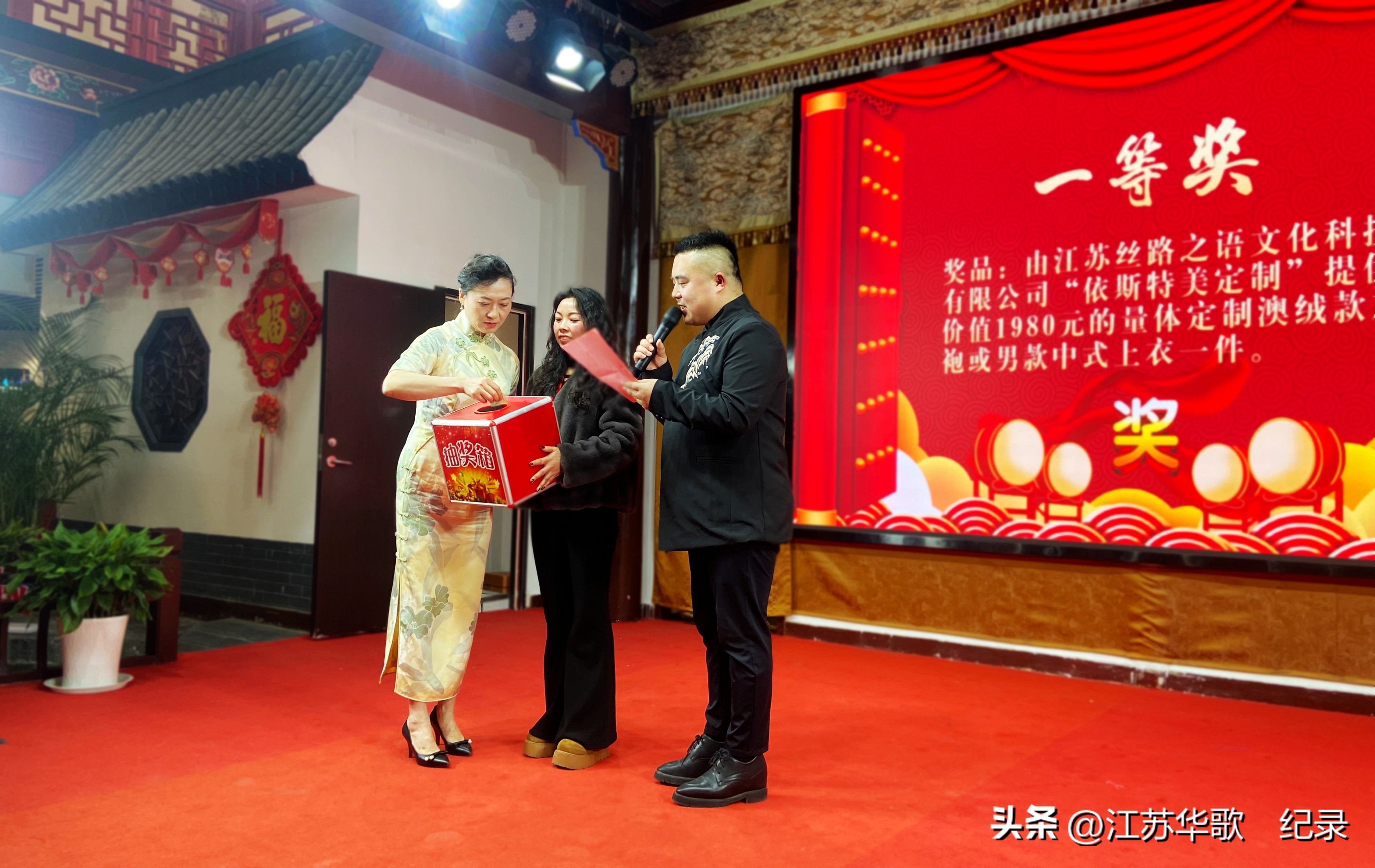 大渔铁板烧的自助餐券、西禾家纺的暖被、莨颜本草的护肤套装、医院的体检医美卡、口腔医院的洁牙券,还有令人心动的定制旗袍大奖……一轮轮抽下来,欢声笑语几乎要掀翻年会现场的屋顶。